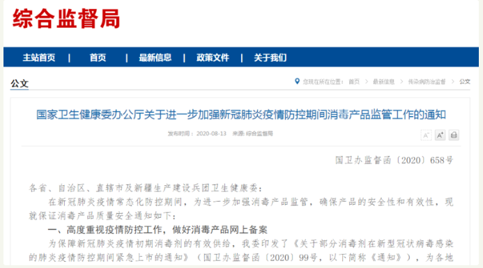 2020年08月13日,國家衛(wèi)生健康委辦公廳發(fā)布了《關(guān)于進(jìn)一步加強(qiáng)新冠肺炎疫情防控期間消毒產(chǎn)品監(jiān)管工作的通知》(以下簡稱《通知》)。